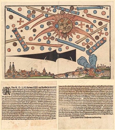 Aviso de prensa (una forma primitiva del periódico) impreso el 14 de abril 1561 en Nuremberg, que describe el fenómeno celeste que se produjo en Nuremberg, el 04 de abril 1561.